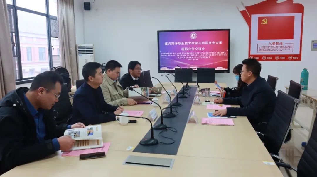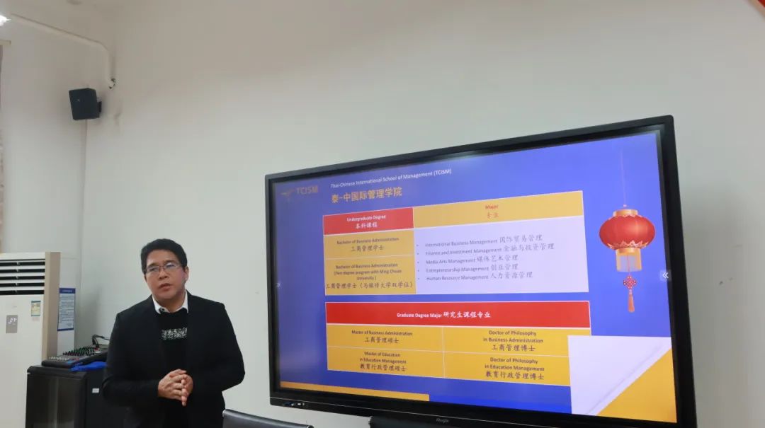 王明亮对学校国际化办学的情况和所取得的亮点成绩表示赞赏,接着从建校情况、院系设置、专业发展、教学模式、特色优势等方面对泰国商会大学进行详细介绍,他期待泰国商会大学接下来能够与学校在教育、科研、文化等方面展开更深入的合作与交流,共同推动两校教育事业的发展、为地方教育文化交流带来更多成果。