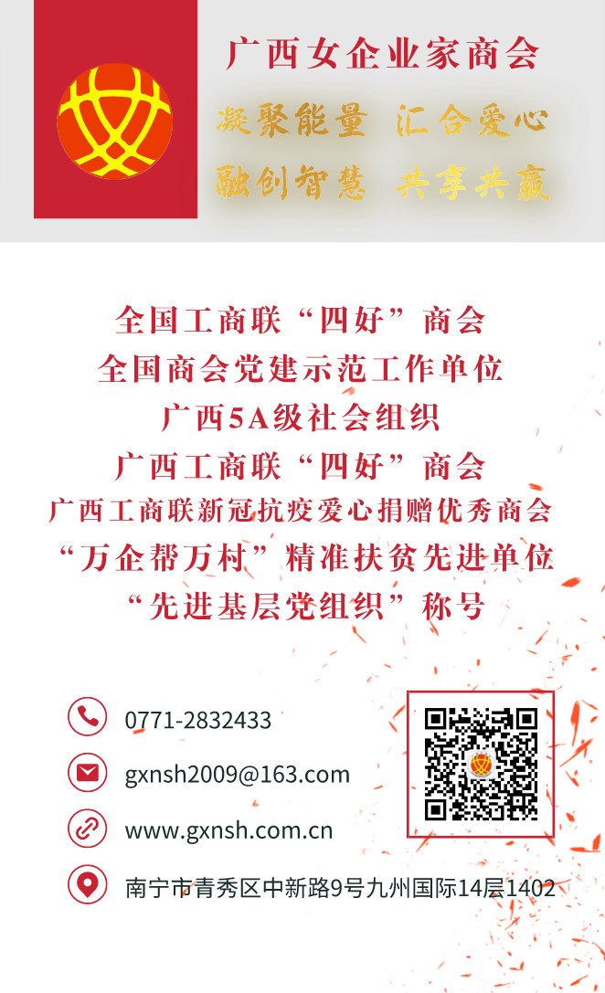 近日,广西壮族自治区工商业联合会发布《自治区工商联关于认定2023年广西“四好”商会的通报》,认定全区185家社会组织为2023年度广西“四好”商会,其中,在广西女企业家商会组织体系共5家荣耀上榜,可喜可贺!
