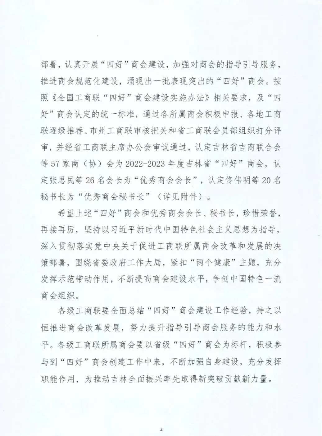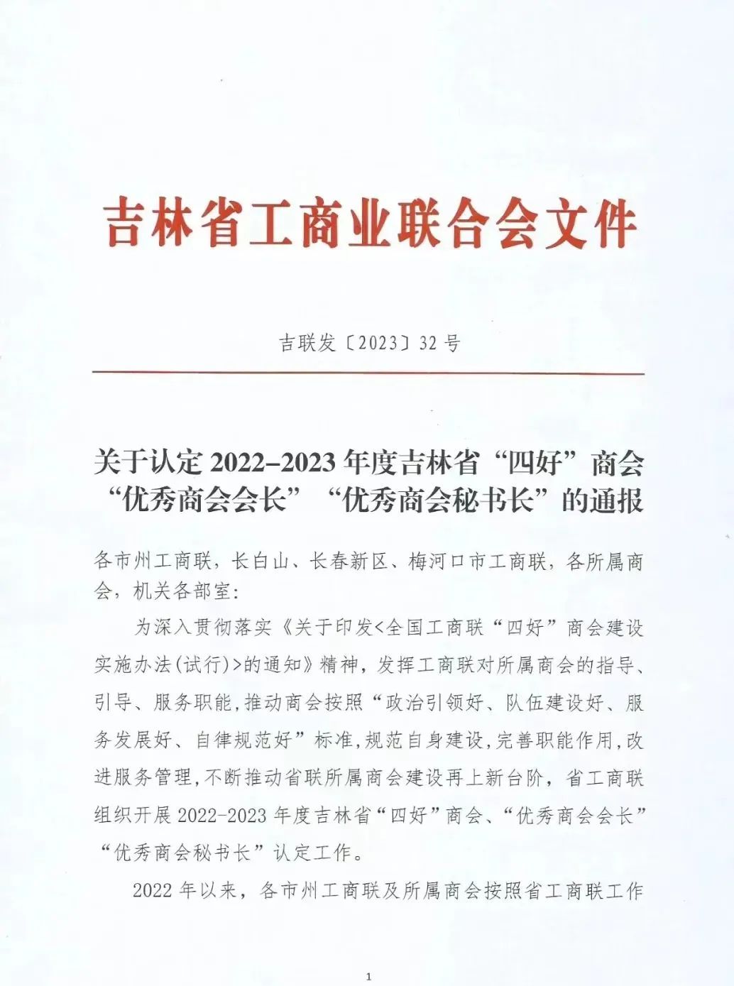 会议对评选认定的2022—2023年度吉林省“四好商会”“优秀商会会长”“优秀商会秘书长”进行了表彰。吉林市福建商会荣获吉林省“四好”商会荣誉称号。