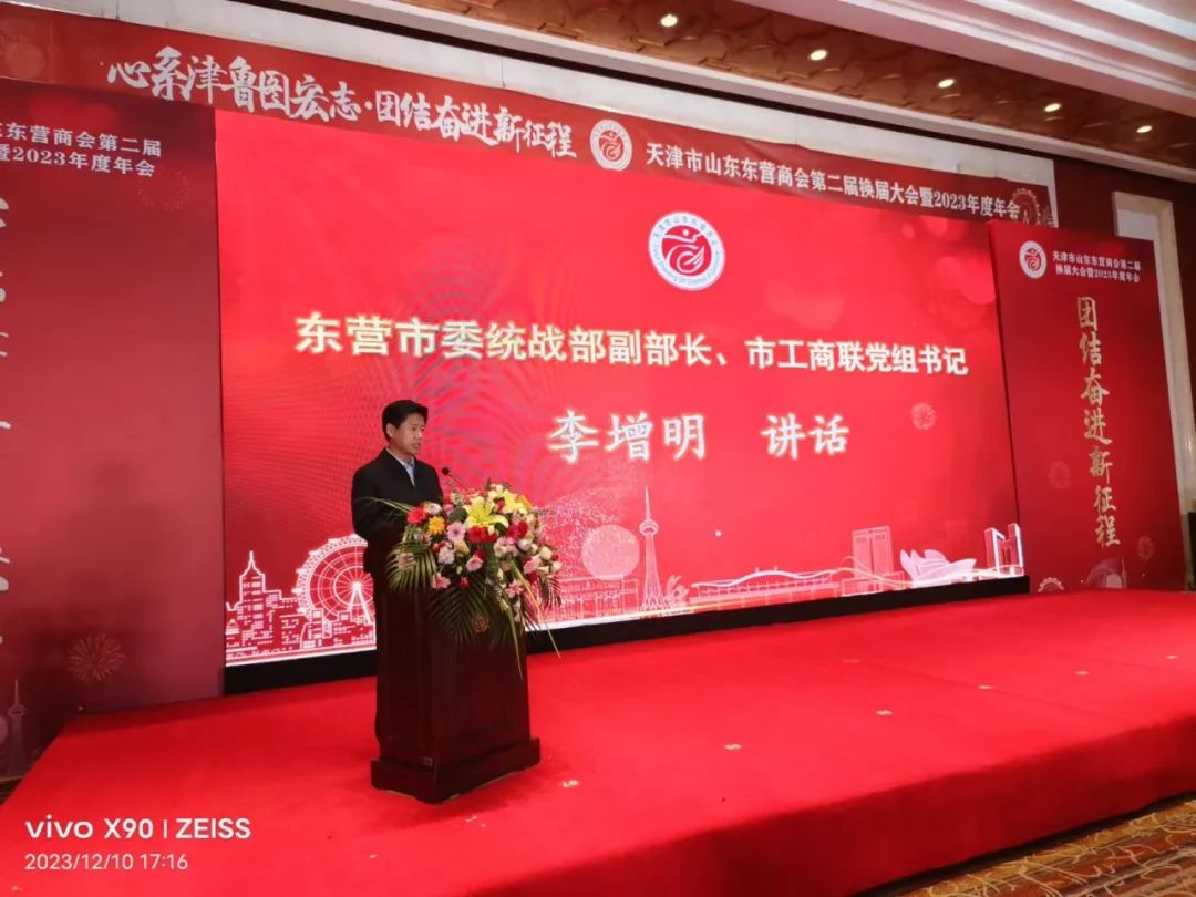 12月10日下午,天津市山东东营商会第二届换届大会召开。市委统战部副部长、市工商联党组书记、常务副主席李增明出席会议并致辞。