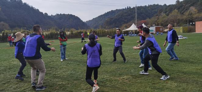 拓展训练环节分成两个小组,各小组团结协作、密切配合,两组你追我赶、奋勇争先,活动过程紧张激烈。