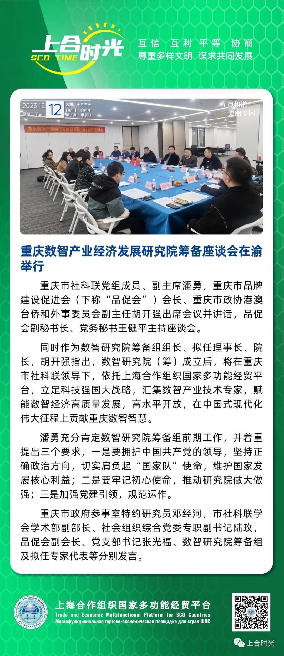 同时作为数智研究院筹备组组长、拟任理事长、院长,胡开强热烈欢迎潘勇主席一行莅临指导筹备工作。介绍了数智研究院(筹)发起背景、发展定位和战略规划。强调,在当前数字全球化时代背景下,数智研究院(筹)成立后,将在重庆市社科联领导下,依托上海合作组织国家多功能经贸平台,立足科技强国大战略,汇集数智产业技术专家,围绕智能制造等产业领域加强研究,推动成果应用转化,赋能数智经济高质量发展,高水平开放,在中国式现代化伟大征程上贡献重庆数智智慧。