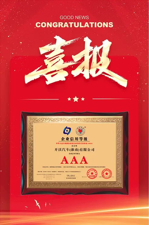 近日,安徽省徽企质量信用评价中心向开沃汽车(淮南)有限公司(简称淮南开沃)颁发了“AAA级信用企业”证书及牌匾,这是淮南开沃扎根江淮大地获得肯定的又一成果,更是淮南开沃人的一份莫大的荣誉。