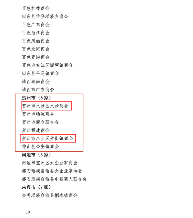 12月5日,自治区工商联印发《关于认定2023年广西“四好”商会的通报》,认定桂商总会等185家商会为2023年“政治引领好、队伍建设好、服务发展好、自律规范好”的广西“四好”商会。其中,贺州市八步区八步商会、贺州市八步区贺街镇商会等2家商会获得广西“四好”商会荣誉称号。