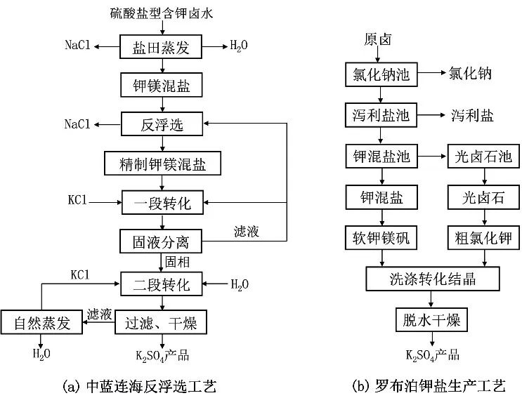 图6 硫酸盐型钾盐反浮选工艺和国投新疆罗布泊钾盐生产工艺流程