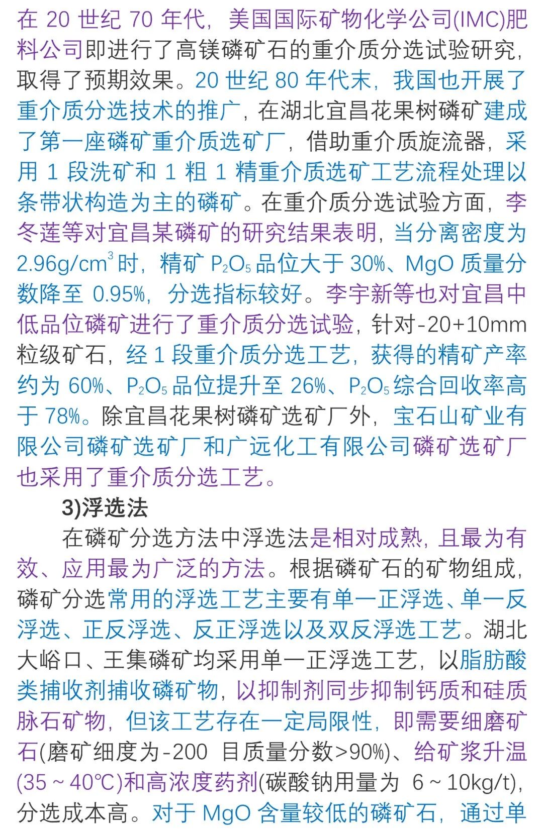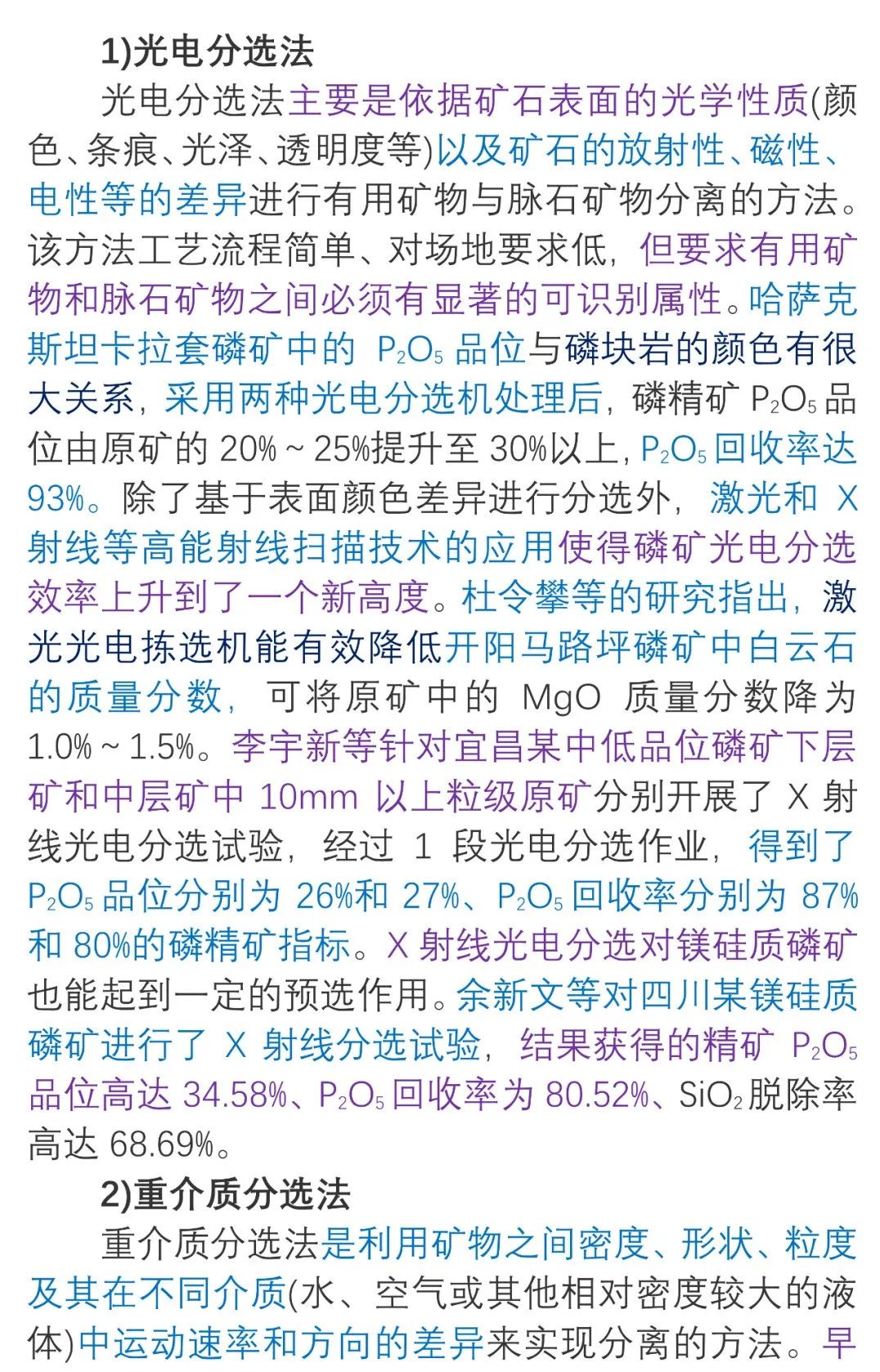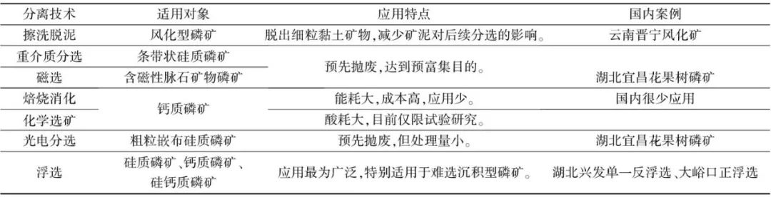 国内萤石资源主要分布于江西、浙江和湖南等地。萤石矿床一般分为单一型萤石矿床和共伴生型萤石矿床,其中前者占53%,后者占47%。按矿床成因可将萤石矿床分为沉积改造型、热液充填型和伴生型萤石矿床(见表4)。我国萤石矿床以沉积改造型和热液充填型为主,矿山生产规模以中小型为主,总数超1200个。综上可知,磷矿、钾盐、石墨和萤石资源不仅在传统行业发挥着重要作用,而且也是支持我国战略性新兴产业可持续发展的重要物质基础(见表5)。但目前我国这4类非金属矿产资源的消耗速度仍在不断加快,平均品位也在不断下降,因此开发利用杂质含量较高的低品级资源将成为战略性非金属矿产资源开发利用的主要方向,其中分离技术的创新和突破是关键。作为磷肥和精细磷化工产品的生产原料,高品位磷矿石储量逐年减少,对中低品位难选磷矿的开发与利用研究日趋紧迫。磷矿中的有用矿物主要为氟磷灰石、羟基磷灰石、磷灰石和碳氟磷灰石,脉石矿物通常有石英、白云石、云母、黏土矿物等。因此,为获得合格磷精矿,必须对中低品位磷矿石分离技术开展系列研究。目前,国内外磷矿分离提纯方法(见表6)主要有光电分选法、重介质分选法、浮选法、磁选法、化学法等。光电分选法、重介质分选法等能预先去除大量脉石矿物,大大降低后续生产成本,是目前在中低品位磷矿预处理方面最具发展潜力的分离技术;浮选法因分选效率高、技术成熟等优点,是目前工业应用最为广泛的方法。本文重点介绍用于磷矿分选的光电分选、重介质分选以及浮选等分离技术。