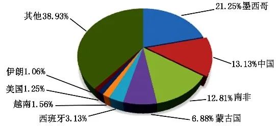 钾盐矿物可分为可溶性钾盐矿物和不可溶性钾盐矿物(含钾硅酸盐矿物):前者主要由自然界含钾的可溶性盐类矿物堆积而成,属可被利用的钾盐矿产资源(一般包括含钾水体经过蒸发浓缩、沉积形成的可溶性固体钾盐矿床和海水、盐湖卤水、含钾卤水等液体钾盐矿床);后者则主要由铝硅酸类矿物(钾长石、明矾石、霞石、白榴石、黄钾铁矾等)构成。目前,可溶性钾盐资源是被开发和利用的主要对象,而非水溶性的含钾矿物因开发成本过高,在工业上未得到大规模应用。我国属于严重缺钾国家,可利用钾盐矿产资源主要类型如表2所示。国内可溶性钾盐资源匮乏,对外依存度和进口集中度均较高。目前国内正在开发利用的可溶性钾盐资源主要为盐湖卤水型液体钾矿,集中分布于罗布泊盐湖区和柴达木盆地盐湖区。石墨为具有层状晶体结构的多键型晶体,晶体结构中既存在共价键和分子键,还有金属键。特殊的晶体结构决定了石墨的特殊物理化学性质,例如,石墨具有较强的润滑性、导热性、耐热性和化学稳定性,因此石墨及其产品往往具有不可替代性,被广泛应用于冶金、材料、环境、生物医药、国防等领域。包括中国在内的很多国家都已将晶质石墨列入本国的战略性矿产资源加以保护。石墨资源在全球分布相对较广泛,几个主要石墨生产国储量占比(来源于《BP世界能源统计年鉴》2021版)如图3所示。全球天然石墨总储量约为34950万t(截至2021年),其中我国以20.90%的储量占比位列世界第二。