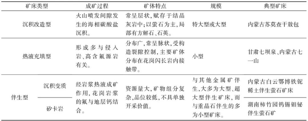 我国天然石墨成矿地质条件优越,资源丰富,分布也较广泛。天然石墨按照晶体直径大小可分为晶质石墨(晶体直径>1μm)和隐晶质石墨(晶体直径<1μm)。我国石墨资源以晶质石墨为主,主要分布于黑龙江和内蒙古等省,而隐晶质石墨则集中分布于内蒙古和湖南两省。地质学者根据石墨矿床成因及矿床的工业价值,将我国主要的石墨矿床分为区域变质型矿床、接触变质型矿床和岩浆热液型矿床3类,其成矿过程和矿体特点等如表3所示。区域变质型矿床以晶质石墨矿床为主,接触变质型矿床则以隐晶质石墨矿床为主,岩浆热液型矿床比较少见。我国不但属于石墨资源大国,而且还是全球第一大石墨生产国和消费国。但受国内石墨深加工技术水平的限制,高端石墨产品供应不足,仍需要进口球形石墨、大鳞片石墨等高端产品,高端产品供应风险依然显著。萤石又称氟石,是氟化工的主要矿物原料,被广泛应用于冶金、陶瓷、水泥、玻璃、化工等行业,精细氟化工产品在新能源、半导体、生物医疗等方面也发挥着重要作用,具有不可替代的战略地位,因此萤石也被称为“第二稀土”。我国萤石的应用范围主要根据萤石资源中CaF2品位进行分类:CaF2品位超过97%的为化工酸级萤石,CaF2品位在85%~95%的为陶瓷级萤石,CaF2品位在65%~85%的为冶金级萤石。全球萤石主要生产国储量占比(来源于USGS2022年统计数据)如图4所示。世界萤石资源分布较不均匀,北美及欧洲等地区资源量较少,结构性稀缺显著。我国萤石储量以13.13%的占比居世界第二位,但我国目前的萤石生产存在产量过大、高品质萤石资源(化工酸级萤石)的静态保障年限短(2019年计算年限为10.5年,远低于全球44.3年的保障年限水平)等问题,高品质萤石供应安全威胁日益加剧。