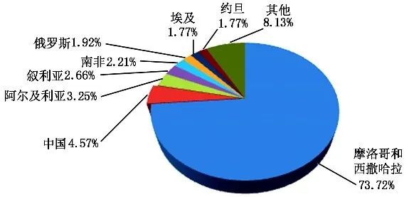 战略性新兴产业的迅猛发展,我国对战略性非金属矿产资源的重视程度也越来越高,《全国矿产资源规划(2016-2020年)》中确定了我国的24种战略性矿产,其中包括磷矿、钾盐、石墨和萤石等4种非金属矿产。选矿试验是矿产资源勘查开发过程中不可缺少的关键步骤,很多非金属矿产资源的勘查和开发主要取决于选矿分离技术。本文系统梳理了我国磷矿、钾盐、石墨和萤石等4种战略性非金属矿产资源的储量、分布、矿床成因及开发利用现状等;全面总结了这4种矿产的典型分离与富集技术进展,分析和概述了不同分离方法的关键技术难点和应用范围。针对性地展望了我国战略性非金属矿产分离技术的发展方向,并为我国非金属工业的健康发展提出了若干建议,研究成果对我国战略性非金属矿产资源勘查和高效开发利用提供了有利参考。在全球范围内,矿产资源分布极不均衡,导致各国矿产品很难做到完全自给自足,这也直接影响了相关产业的发展。尤其是进入21世纪以来,人类社会的发展对矿产品的依赖程度日益加剧,矿业领域早已成为各国博弈的重要阵地。当前,我国新一代信息技术、新能源、高端装备制造、新材料等战略性新兴产业的发展与各类矿产资源的开发及其制品的应用密不可分。加快我国战略性新兴产业发展,符合当前的国家战略,是实现相关产业历史性飞跃的有力抓手。在此背景下,矿产资源的开发和利用水平更能体现一个国家的科技和经济实力。面对矿产资源供应可能出现的危机,美国、欧洲、日本等国围绕萤石、石墨、高纯石英、重晶石等主要非金属矿产陆续提出了“危机矿产”“关键矿产”“战略性矿产”等概念,其实质是为了有效指导其国内非金属矿产资源的开发,实现其非金属工业的可持续发展。早在2002年,基于我国矿产资源形势,中国工程院院士陈毓川提出了建立我国战略性矿产资源可持续安全供应体系的重要措施。此后,在国务院批准通过的《全国矿产资源规划(2016-2020年)》(简称《规划》)中确定了我国的24种战略性矿产,其中包括磷矿、钾盐、石墨和萤石等4种非金属矿产。本文通过简要梳理上述4种战略性非金属矿产资源现状,进而探讨其相关分离技术进展,以期为我国非金属工业的健康可持续发展提供参考。磷不仅是重要的工业原料,也是几乎所有生物体赖以生存的元素之一。磷在地壳中的丰度居所有元素的第11位,质量分数约为0.12%,是一种难再生的重要非金属矿产资源。磷的化学性质活泼且能体现不同的价态,这使得磷元素能发生多种反应生成不同类型的化合物。在自然界中,磷大多以磷灰石(或正磷酸盐)的形式存在,磷矿石是制造磷工业产品的重要原料,在农业、化工、医药、国防等领域都有十分重要的应用,具有不可替代性。全球磷矿石主要生产国储量占比(来源于USGS2022年统计数据)如图1所示。世界磷矿资源分布极不均衡,截至2021年底,全球磷矿石基础储量约710亿t,其中摩洛哥和西撒哈拉地区的储量居首位,占全球总量的73.72%,中国虽位居第二,但绝对量较小,基础储量仅为32亿t左右,占全球总量的4.57%。