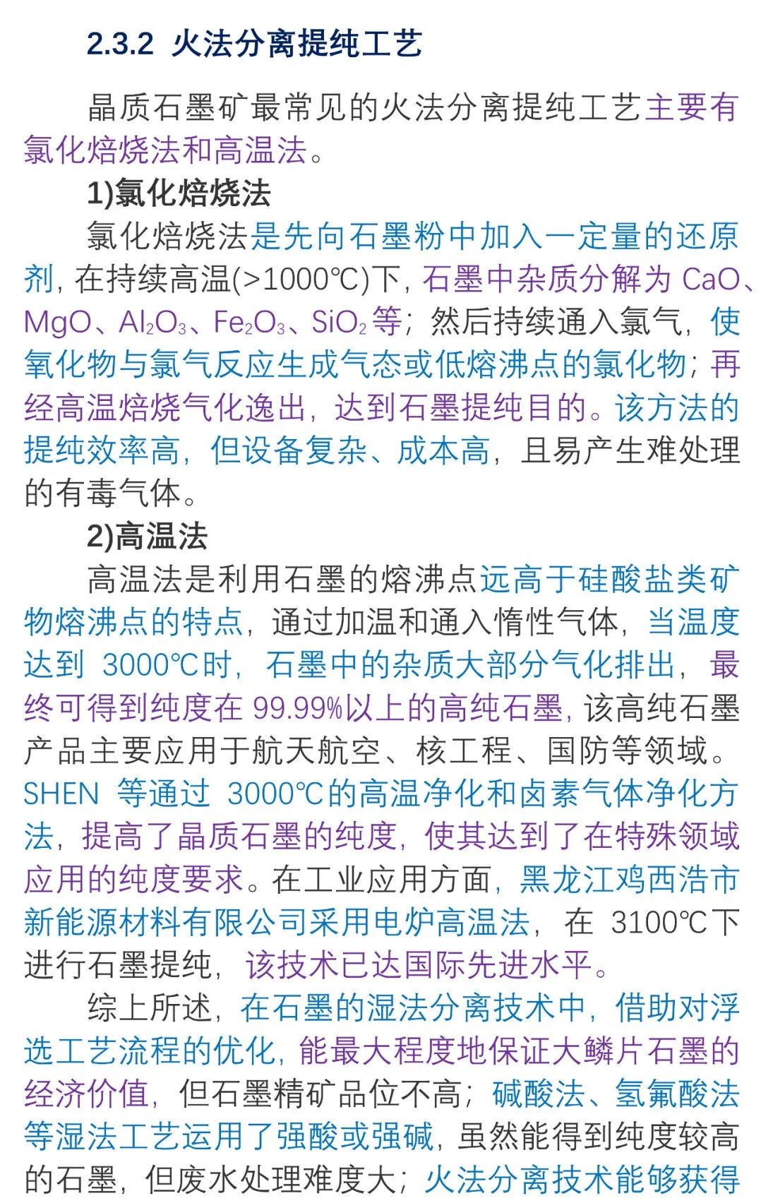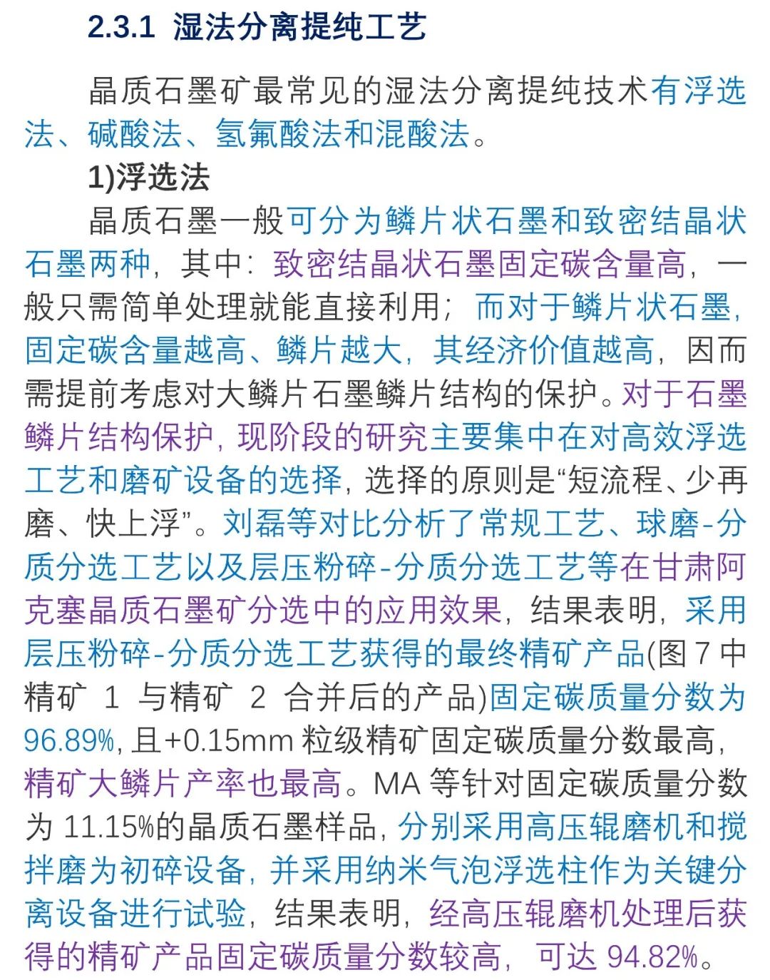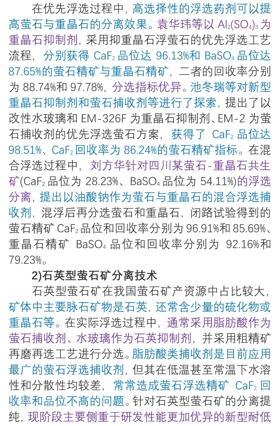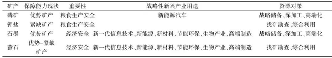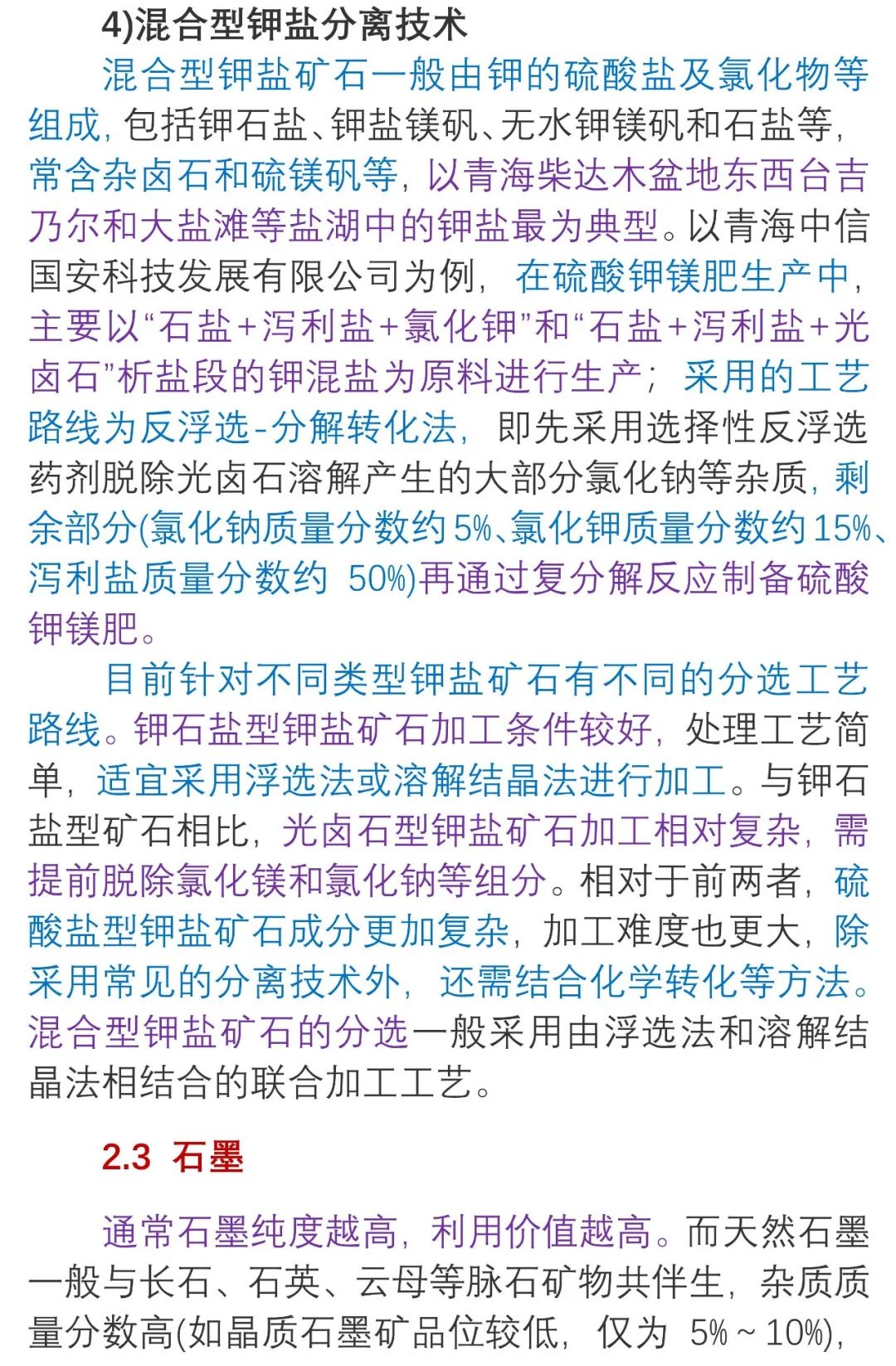 a.磷资源是我国的优势矿产,也是保障我国粮食安全不可替代的矿产资源。磷矿石分离富集技术的发展,对缓解现阶段我国磷资源开发与利用之间的矛盾具有十分重要的意义。磷灰石与脉石矿物间的密度差较小,加上嵌布粒度越来越细,故重介质分选法分选难度也越来越大。光电分选技术在磷矿石预选抛尾中的应用十分成功,一定程度上降低了分选能耗,但处理量和粒度问题仍是阻碍其推广的最大障碍。浮选法仍是目前磷矿选矿中最有效的方法,因此开发新型绿色高效的磷矿浮选药剂必将继续成为磷矿分选的研究热点。b.钾盐分选技术与工艺是从钾盐矿石获得钾盐产品的关键,进一步了解钾盐分选技术研究进展及其应用情况意义重大。在我国的各类钾盐矿石中,钾石盐型钾盐的物相组成相对简单,分选技术以浮选法为主。除钾石盐型钾盐外,其他类型钾盐矿石的物相组成比较复杂,分选技术与工艺相对较繁琐,常需将浮选法与溶解-结晶法相结合,其产品质量和回收率较高,应用前景广阔。c.石墨作为我国重要的战略性非金属矿产资源,在现代工业及战略性新兴产业发展中发挥着不可替代的作用,未来对其需求将呈快速增长趋势。我国天然石墨资源禀赋不佳,加工获得的石墨产品纯度直接影响着下游的精深加工。天然石墨矿采用浮选工艺提纯成本最低,但往往无法得到高品位石墨精矿;碱酸法、氯化焙烧法等虽可得到高品位石墨,但对设备要求高,且易造成环境污染;相比而言高温法提纯效果最佳,但应用范围十分有限。d.受限于选矿技术、生产成本和深加工等的劣势,我国在全球萤石产业战略竞争中的影响力较弱,因此推动萤石分选技术的进步迫在眉睫。就分离方法而言,由于萤石与其常见伴生矿物密度差别不大、磁性都很弱、电位差也十分相近,因而采用重介质分选、磁选、电选等均难获得优异的分离效果。浮选法对于细粒萤石矿而言是最有效的分选方法,是萤石分选研究的重点和热点,而开发具有高选择性的新型、高效、绿色的萤石浮选药剂,有望成为取得萤石分离技术突破的最有效途径。综上所述,我国非金属产业的现状是基于战略性非金属矿产资源的先进产业自主核心技术不足,分离提纯后的产品大多服务于传统的中低端市场。战略性非金属矿产名录的确定,有助于在开发利用非金属矿产资源的同时更好地保护该类资源,并不断推进该类资源分离技术的创新。因此开展战略性非金属矿产资源高效分离技术的研究,是非金属产业战略性发展的重要技术保障,是非金属产业的优先发展方向。