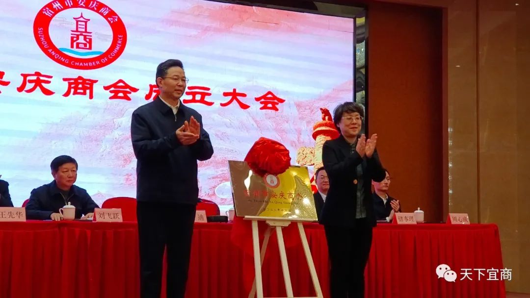 安庆、宿州两市领导为商会和商会党支部揭牌,并为商会会长、监事长、常务副会长、副会长、理事长单位授牌,安徽红杉生物医药科技有限公司董事长高仰哲当选第一届会长。