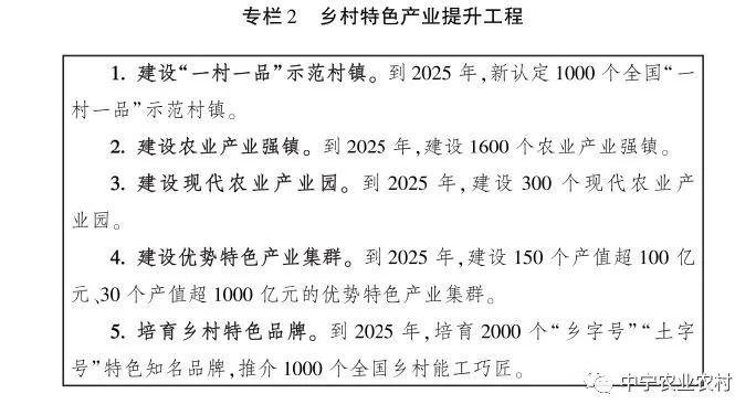 ——乡村特色产业深度拓展。培育一批产值超百亿元、千亿元优势特色产业集群,建设一批产值超十亿元农业产业镇(乡),创响一批“乡字号”“土字号”乡土品牌。