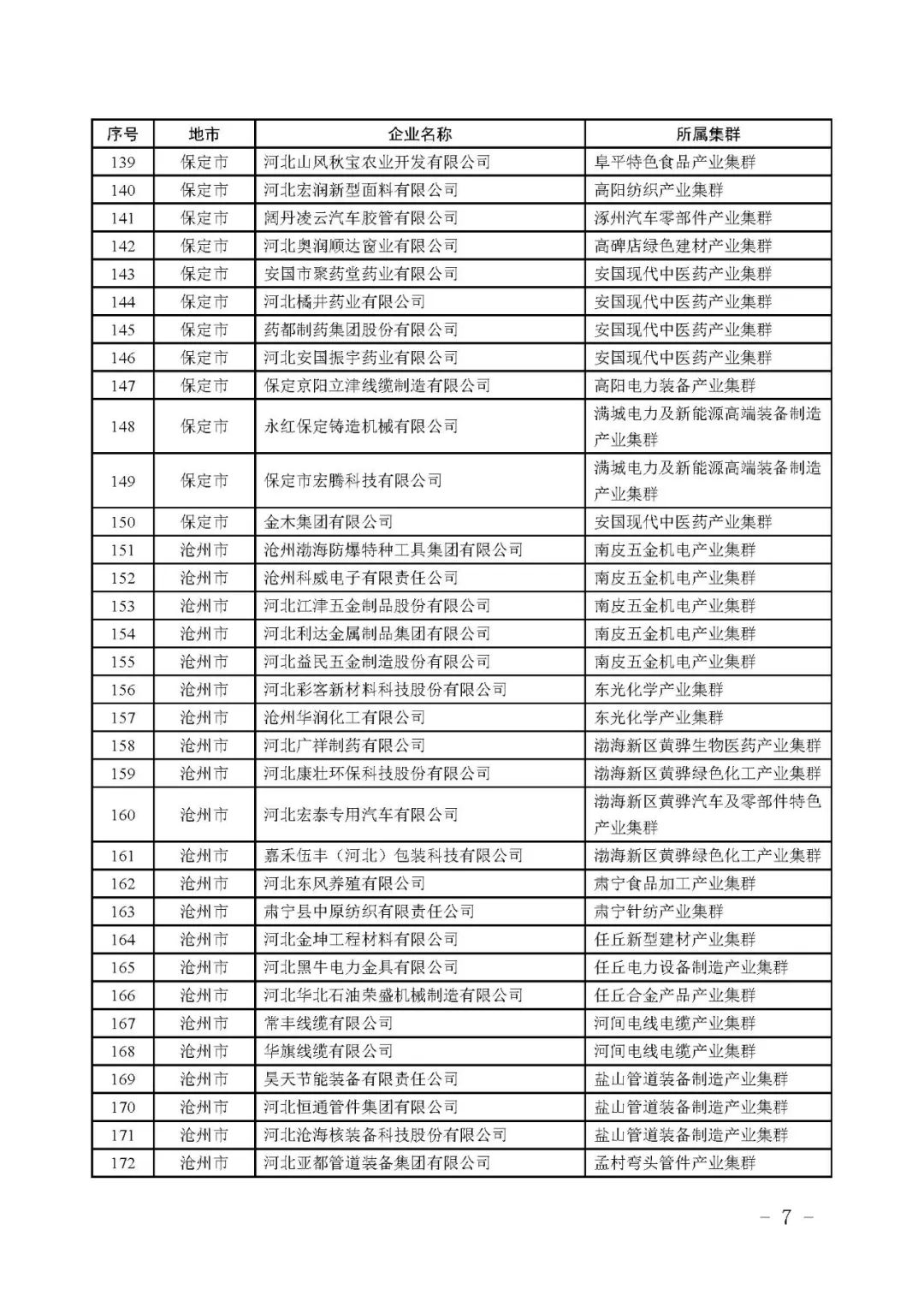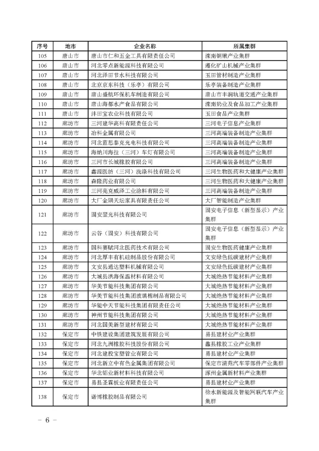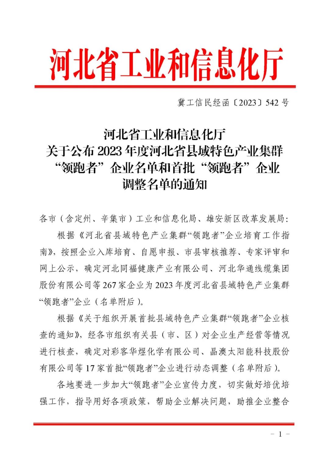 根据《河北省县域特色产业集群“领跑者”企业培育工作指南》,按照企业入库培育、自愿申报、市县审核推荐、专家评审和网上公示,确定河北同福健康产业有限公司、河北华通线缆集团股份有限公司等267家企业为2023年度河北省县域特色产业集群“领跑者”企业(名单附后)。