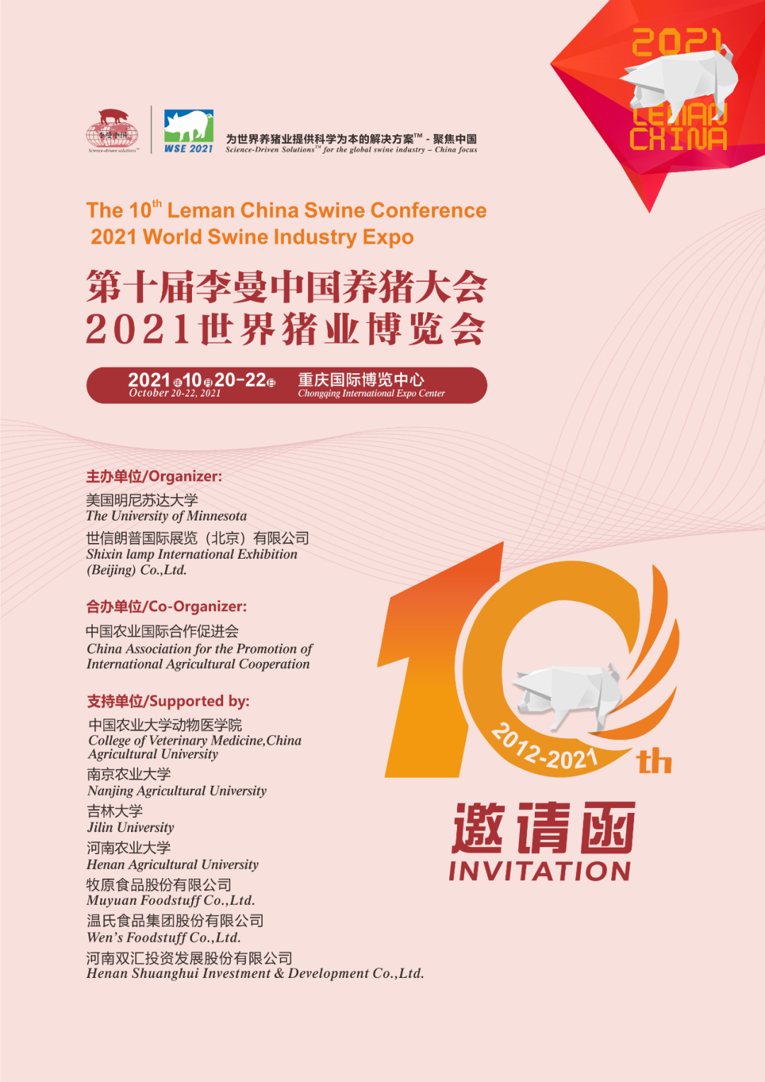 第十届李曼中国养猪大会将于2021年10月20-22日在重庆国际博览中心举办,大会将继续邀请美国、中国及欧洲国家权威养猪专家主讲,为参会代表带来养猪行业的科学解决方案,分享生物安全、疫病防控、诊断及检测、猪场复养、猪场建设、生猪养殖与生产管理技术及运用、猪营养与饲料生产、养猪育种、养猪市场和经济学分析等领域的国际最新资讯和研究成果。本届李曼大会参会代表预计超过10000人,成为首个畜牧行业的万人大会。