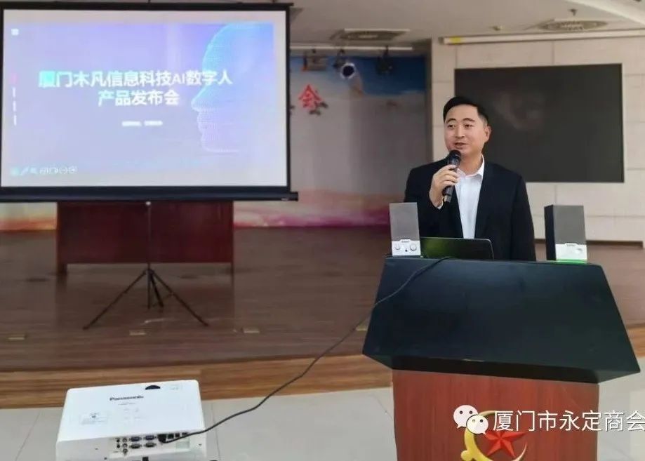 在热烈的掌声中,会长王锦森上台致辞,代表厦门市永定商会对“厦门木凡信息科技AI数字人产品发布会”的举办表示热烈祝贺,祝愿陈总事业兴旺,企业越办越好!并预祝发布会圆满成功。