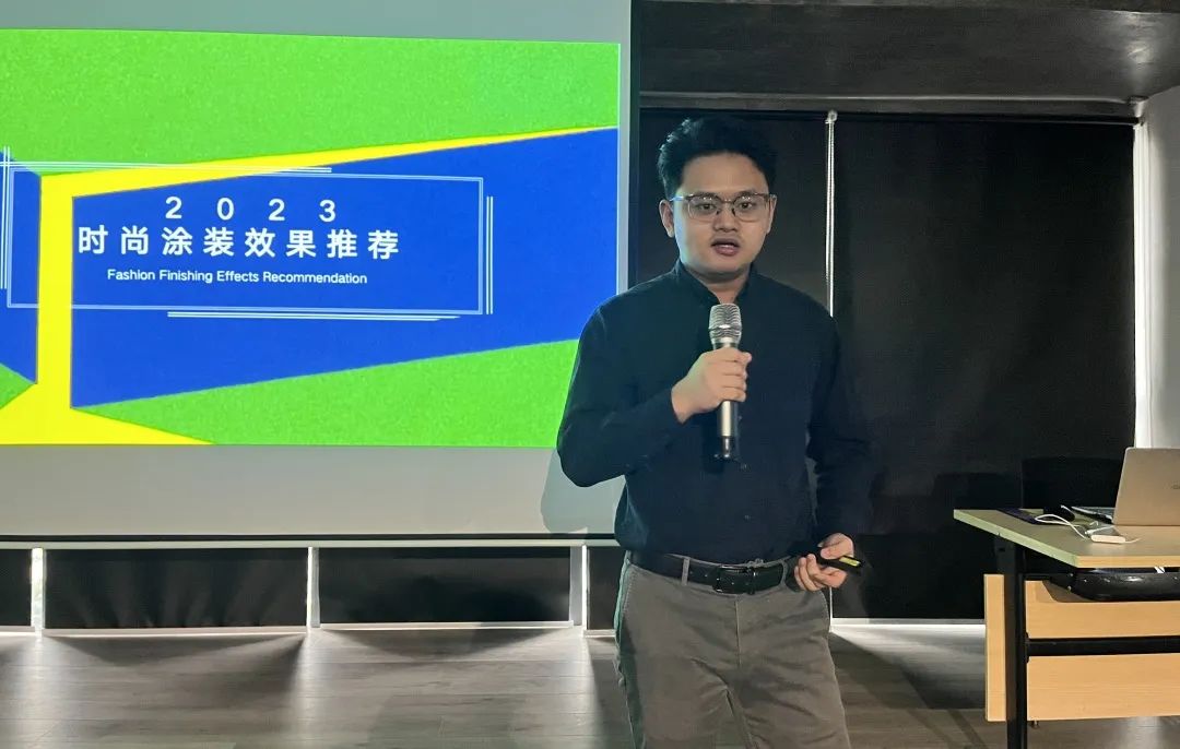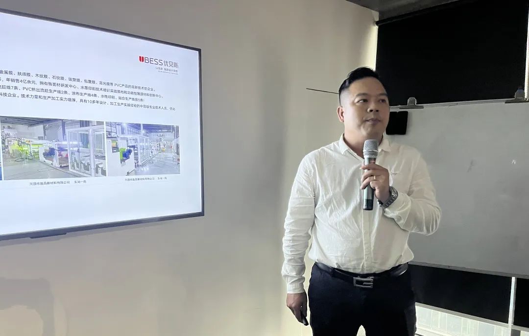 随后,优贝斯市场经理张高先生进行PET花色推介。他向大家介绍优贝斯是一家从事生产制造新材料PETG膜、金属膜和肤感膜等 PVC产品的高新技术型企业。张总结合前沿的设计理念和潮流趋势介绍了多款PET花色新品,帮助来宾精准把握现代人的视感温度,解锁花样生活场景。