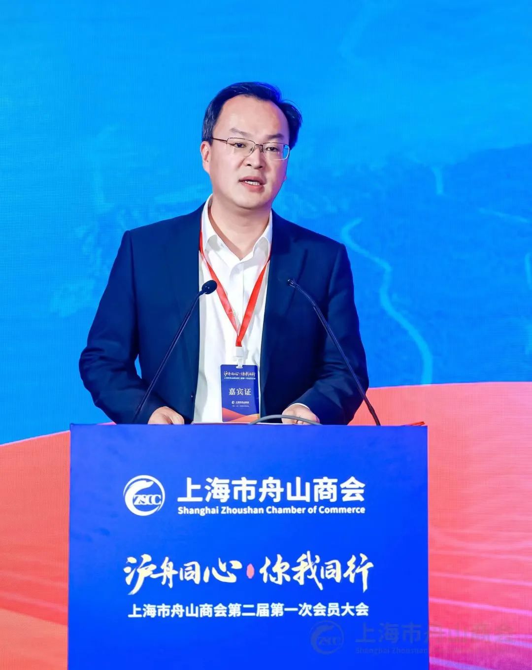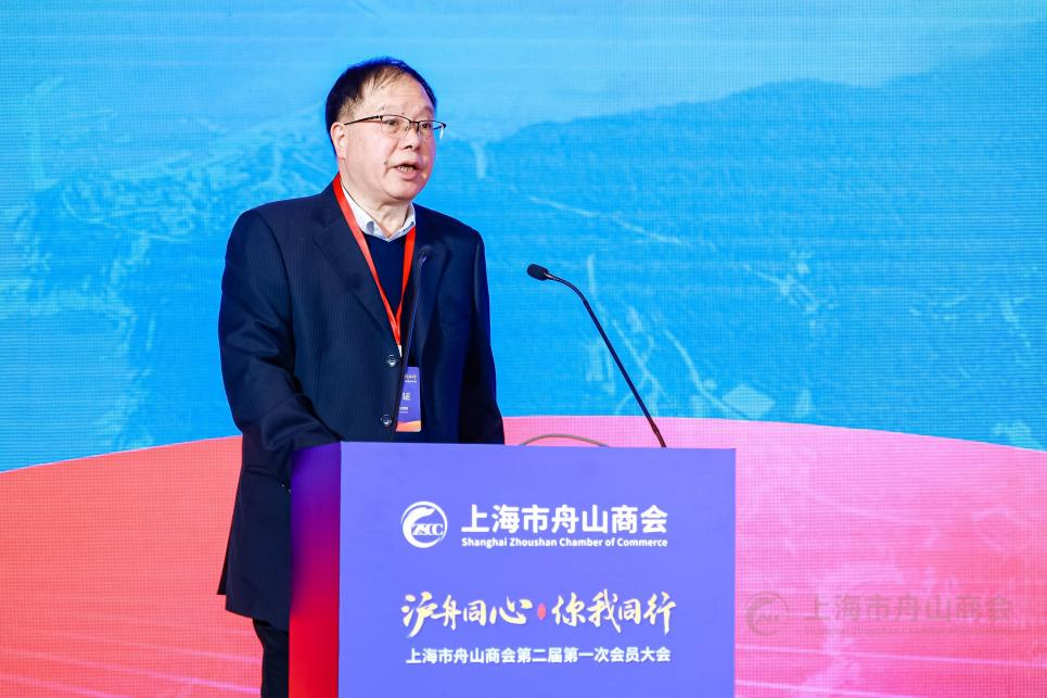 浙江省人民政府驻上海办事处副主任盛乐讲话,他指出,在习近平总书记刚刚考察上海不久,大家齐聚一堂,共同参加上海市舟山商会第二届第一次会员大会暨换届典礼,是沪浙两地关于落实习近平总书记深入推进长三角一体化发展要求的实际践行。他指出,上海市舟山商会在舟山市委市政府和上海市民政局的领导下,充分发挥桥梁纽带作用,全力引导和组织在沪舟商扎根上海、融入上海、融入长三角一体化高质量发展,为推动沪舟两地经济社会、文化科技等各项领域的合作交流作出了积极贡献。商会班子和会员要勠力同心,各扬所长,携手商会发展新征程;要众力齐心,砥砺前行,书写产业发展新篇章;要不忘初心,常来常往,架起沪舟沟通新桥梁。他祝愿在沪舟山乡贤继续讲好新时代舟山故事,争当高质量发展的推动者、浙江品牌的推介者,在上海这片充满机遇与可能的热土上落地生根、开花结果。
