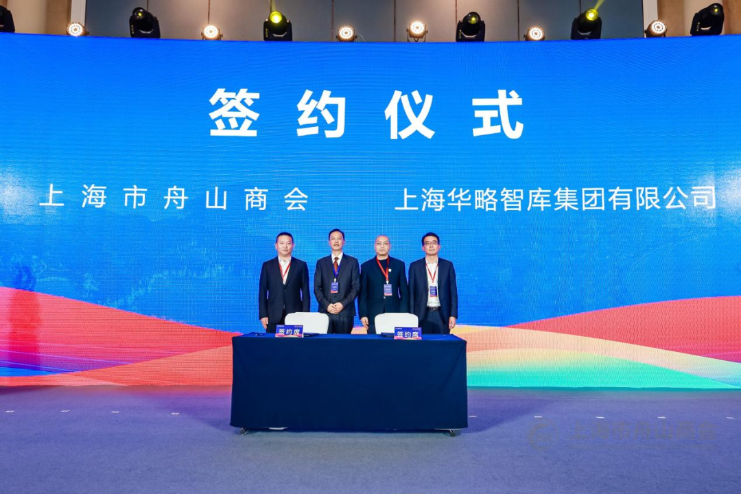 商会和华略智库签署战略合作协议。舟山市委统战部副部长、市工商联党组书记诸葛明海和浙江舟山群岛新区管理委员会驻上海联络处主任邱浩勇见证签约。