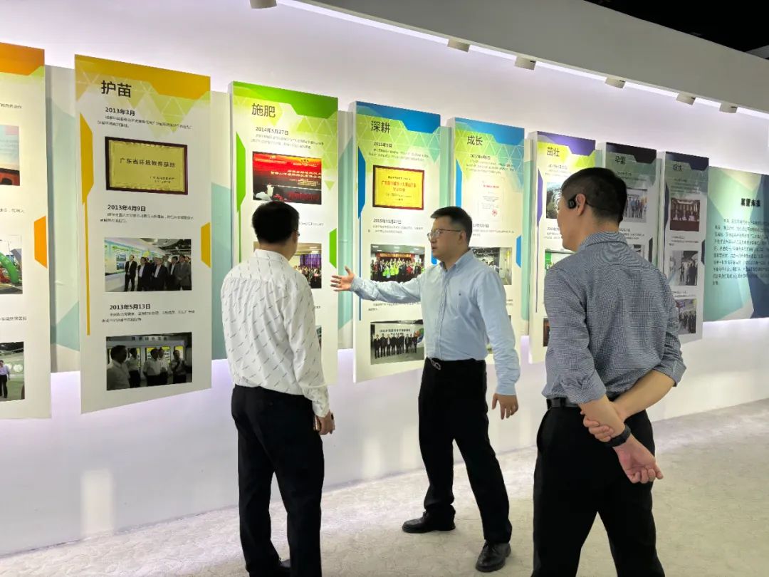 涂总从集聚区的区位优势、职能中心、环保政策、技术应用、智慧环保等几方面展开介绍,来宾对华南集聚区发展成果表现出极大的兴趣,在展厅B区专精特新企业介绍模块前驻足许久。