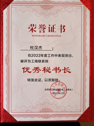 热烈祝贺望牛墩镇工商联(商会)秘书长杜汉杰荣获2022年度全市工商联系统优秀秘书长。