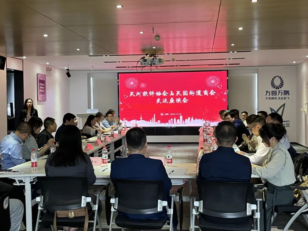 12月14日下午,我协会联合广州市天河区天园街道商会于万鹏高新技术企业孵化基地组织开展了交流座谈会。天园街道办事处二级调研员明强、天园街道商会会长施仁忠、天园街道商会秘书长陈紫君、商会会员代表及我协会秘书长杨楚州、协会会员代表出席活动。会议由天河软件协会秘书长杨楚州主持。本次座谈会旨在加强双方的合作与交流,共同探讨行业发展趋势,为未来的合作打下坚实的基础。
